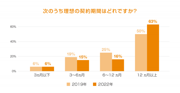 仕事の安定性を示す契約期間については、実態と理想について2019年以上に大きな乖離が見られます。2019年の調査では理想の契約期間を「12カ月以上」と回答した契約・派遣社員が50%だったのに対し、2022年では63%に数値が伸びています。理想とする契約期間とは違い、実際に企業が提示する契約期間は、1位「3カ月以下」(33%)、2位「3~6カ月」(29%)でした。
