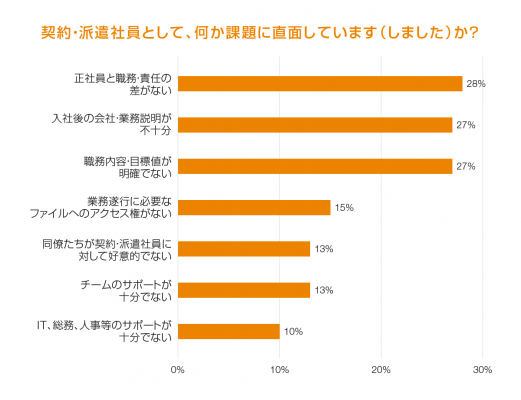 さらに、通常業務で契約・派遣社員が直面する課題は、1位「正社員と職務・責任の差がない」(28%)、同率2位「入社後の会社・業務説明が不十分」、「職務内容・目標値が明確でない」(27%)という結果でした。
