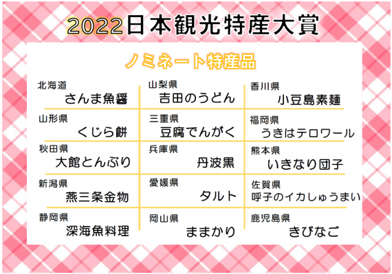 ◆審査方法:一般社団法人日本観光文化協会会員によりノミネートされた観光特産品を当協会専門委員会による選考で15品に絞りこみ