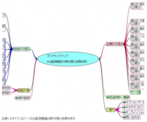 ネオテクノロジー「5G通信機器の熱対策と放熱材料 - ダイナミックマップ」は5G機器向けの熱対策と放熱材料に着目し、5G通信機器やインフラ向け冷却・放熱技術関連の特許技術をまとめています。