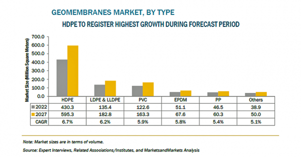 ジオメンブレンの市場規模は、2022年の26億米ドルからCAGR7.6%で成長し、2027年には37億米ドルに達すると予測されています。ジオメンブレン市場の成長は、アジア太平洋や南米を中心とした採掘活動の増加、廃棄物や水の管理活動に対する高い需要に起因しています。さらに、インフラ整備への支出の増加も、今後の市場を牽引すると思われます。一方、原料価格の変動は市場の成長を制限する可能性があります。