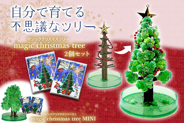 『マジッククリスマスツリー』とは、魔法の水をかけるとモコモコと葉っぱが生えてくる不思議で可愛いクリスマスツリーです。2個セットはマジッククリスマスツリーのレギュラー(カラー:グリーン)とミニ(カラー:グリーン)を限定販売しています。