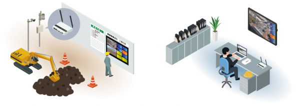 一方屋内の場合は、建設現場の監視用として現場事務所での使用や、監視カメラ管理用途としての使用が可能なシステム構成となっています。
