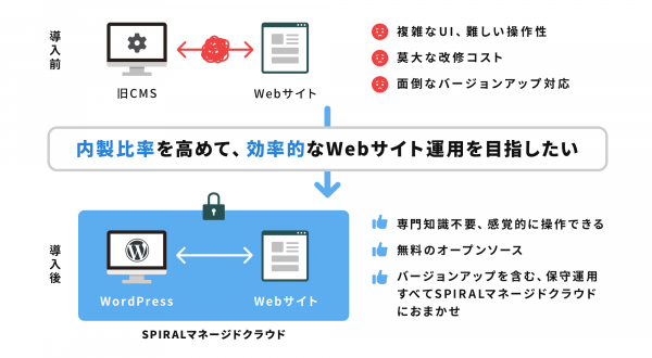 そこで、モードツーは、まず操作性とコストの課題を解決し、内製比率を高めるためのツールとしてWordPressを採用しました。WordPressは、CMSの中でも非常に高いシェアがあります。そのため、多くの活用事例があることで学習コストが低く、カスタマイズの柔軟性が高いことが特徴です。しかしながら、WordPressにはセキュリティ上の懸念があります。モードツーは、セキュリティ強化の顧客要望に応えるために、セキュリティや改ざんの監視、自動と手動のバックアップといったセキュリティの観点からSPIRALマネージドクラウドを採用しました。