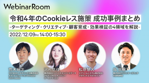 ビジネスマンの役に立つ動画がいつでも無料で観られるウェビナープラットフォーム「Webinar Room(ウェビナールーム)」(https://webinar-room.net/)を運営する株式会社ヒトクセは、2022年12月9日(金)14:00~にCCCMKホールディングス株式会社、株式会社クリエイターズマッチ、スプリームシステム株式会社、株式会社メンバーズのメンバーズデータアドベンチャーカンパニーとの”令和4年のCookieレス施策 成功事例まとめ~ターゲティング・クリエティブ・顧客育成・効果検証の4領域を解説~”をテーマに共催ウェビナーを開催します。