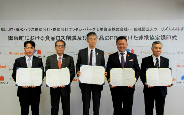 積水ハウス株式会社、三重県御浜町、株式会社クラダシ、パーク七里御浜株式会社、一般社団法人ツーリズムみはまの5者は、「御浜町における食品ロス削減及び特産品のPRに向けた連携協定」を11月28日に締結しました。積水ハウスとマリオット・インターナショナルが推進する地方創生事業「Trip Base 道の駅プロジェクト」の地域活動の取り組みとして、積水ハウスが協定締結の主導を行いました。このたびの連携により「Kuradashi」での商品の販売や、各者からの発信を通したフードロス削減に対する消費者の意識の向上に加え、担い手不足による未収穫産品の解消や不揃い、傷があるなどの規格外果実の加工によるフードロスの削減、一次産業における消費行動への変容を促すこと及び、御浜町の特産品PRと地域活性化を目指します。