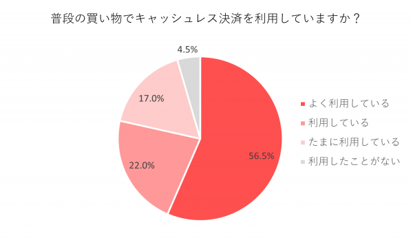 「よく利用している」56.5%、「利用している」22%、「たまに利用している」17%、「利用したことがない」4.5%という結果に。ほとんどの人がキャッシュレス決済を利用しているようです。