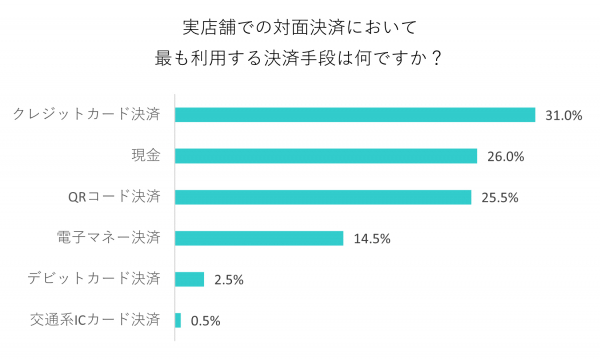 最も多かったのが「クレジットカード決済」で31%、次いで「現金」26%、「QRコード決済」25.5%、「電子マネー決済」14.5%、「デビットカード決済」2.5%、「交通系ICカード決済」0.5%でした。