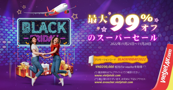 (東京、2022年11月25日) - ベトジェットは、ブラックフライデーとサイバーマンデーに合わせて、11月25日から4日間限定で大変にお得なチケットキャンペーンを開催しています。