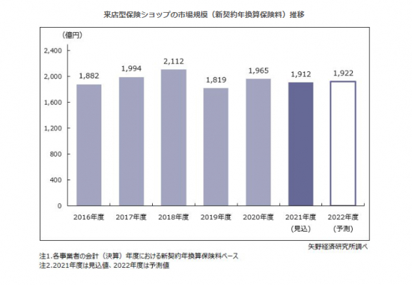 2021年度は行動制限などの緩和が図られてはいるが、長引くコロナ禍の影響は残り来店客の戻りは厳しく、店舗の統廃合も進んだ。収益面でも増収増益となった来店型保険ショップ経営企業もあるが、減収減益の企業も増え、格差が一層鮮明化した。その結果、2021年度の来店型保険ショップ市場規模(新契約年換算保険料)は前年度比2.7%減の1,912億円と見込む。