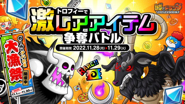 11月28日(月)から11月29日(火)まで、ゲーム内のトロフィー獲得を目指して戦うバトルイベント「トロフィーバトル」が開催されます。今回は、トロフィーに挑み、勝利した際に“ルビー”や“ドラゴンメダル”などが獲得できる「トロフィーで激レアアイテム争奪バトル」を同時開催。“ひとりで”でも“みんなで”でももらえますので、勝利を掴んでたくさんの報酬をゲットしましょう!