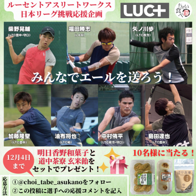 アスリートを応援する明日香野のサブアカウント、ちょい食べ明日香野をフォローして、「ルーセントアスリートワークス日本リーグ挑戦応援キャンペーン」の投稿に選手への応援コメントをすることで参加可能です。