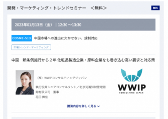 講演テーマ:「中国 新条例施行から2年 化粧品製造企業・原料企業をも巻き込む高い要求と対応策」
