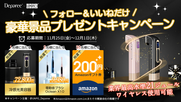 鑫三海株式会社は、楽天市場 公式店舗「SINSANKAI」での販売を記念して、2022年11月25日よりunpo_depareeのTwitter公式アカウントで、Amazonギフト券等豪華賞品が抽選で当たる「Deparee Twitterキャンペーン」を開催しました。