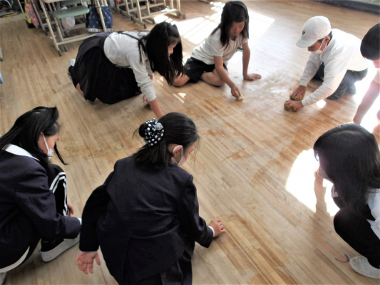 また、同校の教室の床磨きを行う際に、プラスチック製のメラミンスポンジに替えて、自分たちで作製したヘチマたわしを使いました。子供達からは、「ちゃんと汚れが取れる」、「ヘチマたわしは意外と丈夫」、「家でも使ってみたい」との声があがりました。この他、子供達が家庭に持ち帰り、プラスチック製のキッチンスポンジや、お風呂で使うナイロンタオルに替えて、ヘチマたわしを使う予定です。