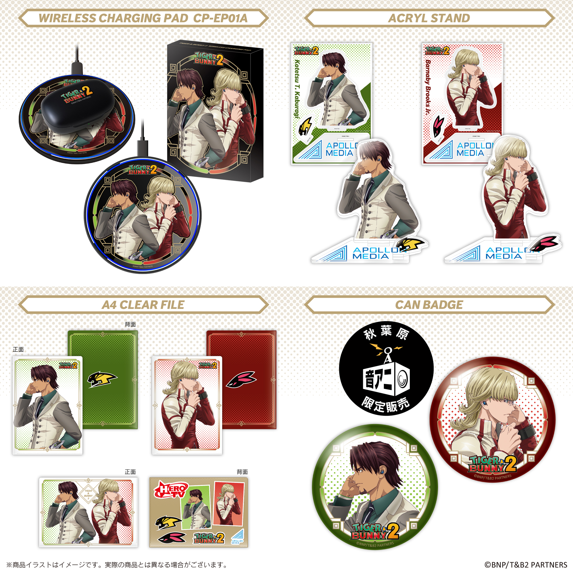 本コラボレーションモデルは、充電ケース天面にタイトルロゴを印刷加工、左右ハウジングには、「アポロンメディアロゴ」をレーザー加工し、起動時にLED点灯致します。音声ガイダンスは鏑木・T・虎徹(CV.平田広明)と、バーナビー・ブルックス Jr.(CV.森田成一)の録り下ろしボイスを搭載。電源オンやオフ、ペアリング時やタップ音等、計11ワードの内容となっております。パッケージは描き下ろしイラストのオリジナルデザインとなります。