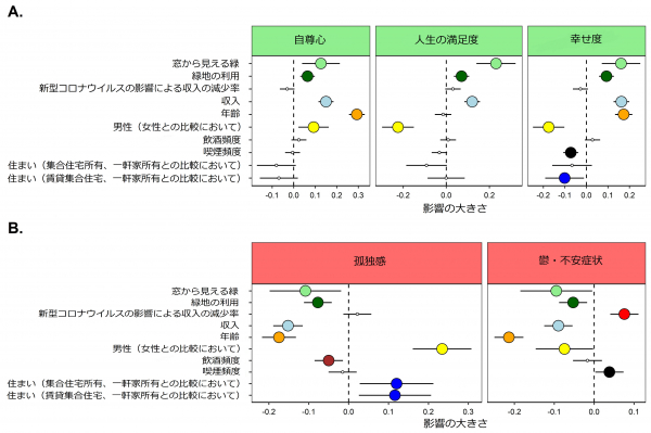 1.庭において自然とふれあう人は、ネガティブな感情(鬱・不安症状・ストレス等)が少なく、ポジティブな感情(生活の質や幸福感等)が高い。