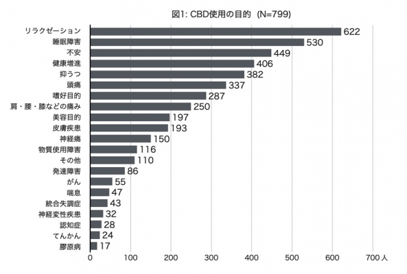 CBD使用経験者(過去1年以内にTHCを含む大麻使用者を除く)を対象としFacebook、Twitter、YoutubeなどのSNSを用いて回答を依頼したところ、799件の有効回答が得られました。CBD製品の用途として多かったのはリラクゼーション(77.8%)、睡眠改善(66.3%)、不安(56.2%)、健康増進(50.8%)、抑うつ(47.8%)であり、使用者は平均して5.5の目的に対してCBDを使用していました。