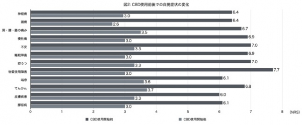使用前後の各症状についての重症度自己評価で50%以上の改善を自覚していた割合は以下のとおりでした。(頭痛70.9%、慢性疼痛67.8%、睡眠障害67.4%、物質使用障害66.7%、神経痛65.5%、抑うつ62.4%、不安59.6%、関節痛54.5%、膠原病50.0%、皮膚疾患49.7%、てんかん42.1%、ぜんそく37.8%)