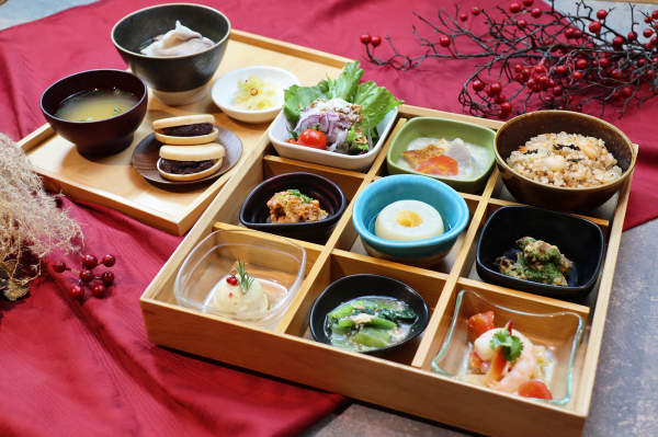 冬メニューは、料理人が手作りする旬の食材を使った12種類の小鉢がフルリニューアル。さらに、寒い季節に嬉しい、玉ねぎをじっくりあめ色になるまで炒めたオニオンスープに、チーズトーストを浸すことでオニオングラタンスープ風に食べられる洋風スープも初登場。