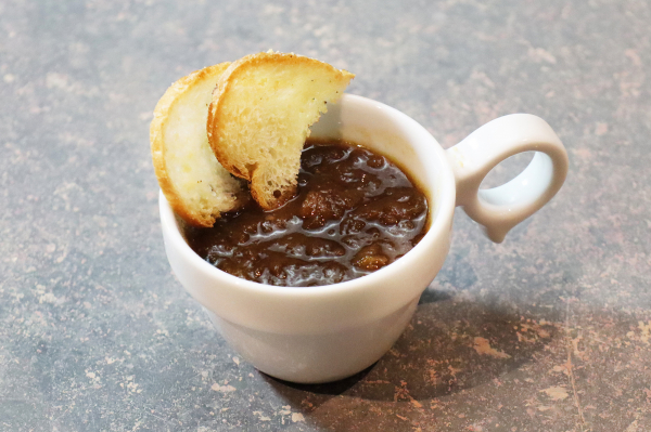 洋のスープは、この時期にぴったりな「オニオングラタン(風)スープ」。大量の玉ねぎをあめ色になるまでしっかり炒め、甘みと旨味が凝縮したオニオンスープ。そこにカリッと焼いたチーズ乗せトーストを入れて、お好きな食感でご賞味いただくのが銀座朝食ラボからの新提案です。じっくりふやかせば、まるでオニオングラタンスープのような味わいに。