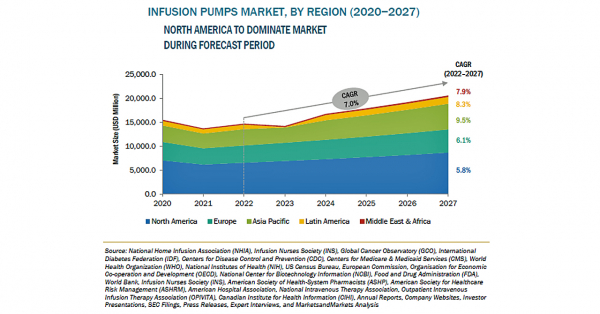 輸液ポンプの市場規模は、2022年の147億米ドルからCAGR7.0%で成長し、2027年には205億米ドルに達すると予測されています。高齢者人口の急増に伴う慢性疾患の発生率の増加、外来輸液ポンプに対する需要の高まり、外科手術の増加といった要因が、輸液ポンプ市場の成長を牽引しています。輸液ポンプ市場の最新動向としては、スマートポンプとEMRの相互運用性、特殊ポンプなどが挙げられます。一方、新製品に対する厳しい規制、輸液ポンプに関連する投薬ミス、再生品やレンタル輸液ポンプの採用の増加などが、2027年までの市場成長を抑制するものと考えられます。