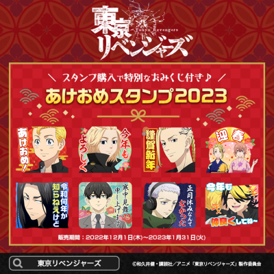 株式会社インクルーズ(東京都渋谷区、代表取締役社長 山﨑 健司)は、LINE株式会社(東京都新宿区、代表取締役社長 出澤 剛)が運営するコミュニケーションアプリ「LINE」内の公式スタンプショップにて、TVアニメ『東京リベンジャーズ』の「あけおめスタンプ」をLINE公式スタンプとして2022年12月1日(木)に配信を開始致しました。