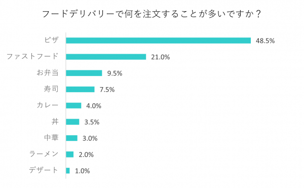 最も多かったのが「ピザ」で48.5%、次いで「ファストフード」21%、「お弁当」9.5%、「寿司」7.5%、「カレー」4%、「丼」3.5%、「中華」3%、「ラーメン」2%、「デザート」1%という結果でした。