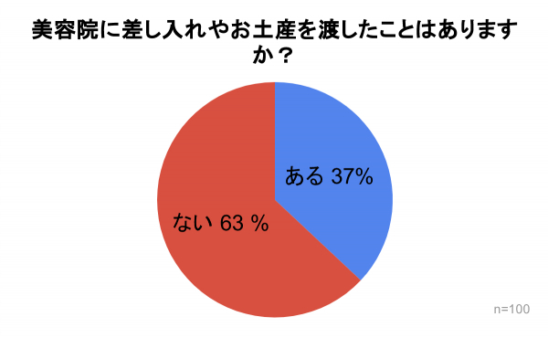 「美容院に差し入れやお土産を渡したことはありますか?」の質問では、『ある』が37%、『ない』が63%という結果となり、3人に1人以上が美容師さんや美容院に差し入れやお土産を渡したことがあることがわかりました。