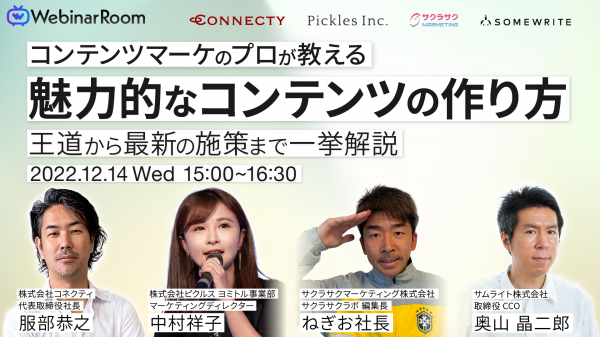 ビジネスマンの役に立つ動画がいつでも無料で観られるウェビナープラットフォーム「Webinar Room(ウェビナールーム)」(https://webinar-room.net/)を運営する株式会社ヒトクセは、2022年12月14日(水)15:00~にサクラサクマーケティング株式会社、株式会社ピクルス、サムライト株式会社、株式会社コネクティとの”コンテンツマーケのプロが教える魅力的なコンテンツの作り方~王道から最新の施策まで一挙解説~”をテーマに共催ウェビナーを開催します。