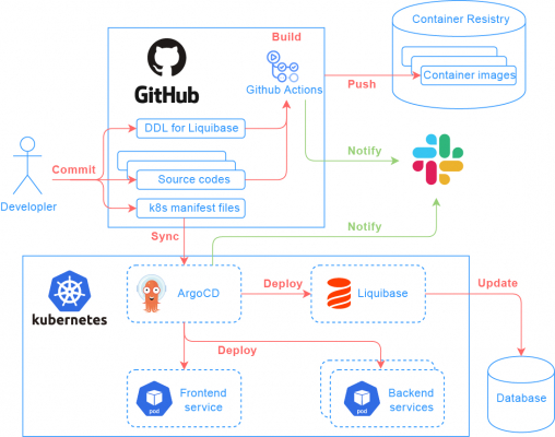 CIにはGitHub Actions、CDにはArgoCDを使用し、データベーススキーマ構成管理には、Liquibaseを使用することで、サービスの更新に合わせたデータベース更新も自動で実行されます。