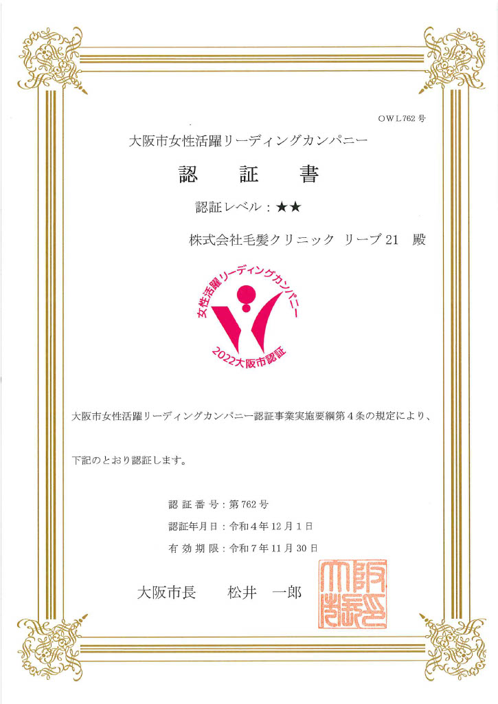 リーブ21は、その制度で「二つ星認証★★(制度面の整備に加え実績が伴う企業)」を今回獲得しましたので、今後は最高ランクの三ツ星認証★★★を目指しより一層、女性の方が活躍できる会社づくりに取り組んでまいります。