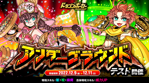 株式会社アソビズム(本社:東京都千代田区、代表取締役:大手智之)は、App Store・Google Playにて好評配信中のリアルタイム合体カードバトル『ドラゴンポーカー』で、2022年12月9日(金)より「アンダーグラウンド」をテスト開催いたします。