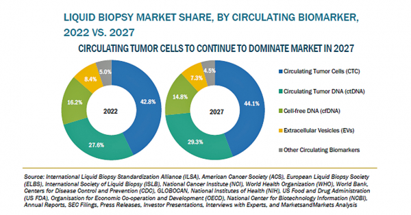 リキッドバイオプシーの市場規模は、2022年の43億米ドルからCAGR18.3%で成長し、2027年には100億米ドルに達すると予測されています。同市場の成長は、癌の、有病率の上昇や、効率的な治療モニタリングや再発検知と相まって、その早期発見へのニーズが高まっていることなどにより、支えられているものと予想されます。リキッドバイオプシーは、従来の診断方法よりも早期にがんの再発を発見することを可能にし、同検査によって可能になる早期診断は、様々ながん治療の改善に役立ちます。一方、特定のリキッドバイオプシーの感度が低いことが、市場の成長を抑制する要因として作用する可能性があります。