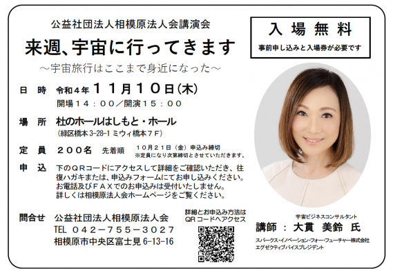 世界中の人々の夢を宇宙で実現させる民間宇宙サービスプラットフォームを提供する宇宙ベンチャー企業株式会社ASTRAX(アストラックス、以下 ASTRAX、本社:神奈川県鎌倉市、代表:代表取締役・民間宇宙飛行士 TAICHI(山崎大地))は、公益社団法人相模原法人会主催による、宇宙ビジネスコンサルタント大貫美鈴氏の講演会「来週、宇宙に行ってきます~宇宙旅行はここまで身近になった~」をサポートし、2022年11月10日に開催されました。