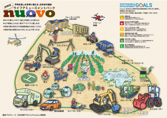一般財団法人日本笑顔プロジェクト(所在地:長野県上高井郡小布施町、代表:林英寿)が進めている「平時を楽しみ有事に備える」、日本初の施設です。2019年台風19号災害・長野県の被災地支援からアイデアが生まれました。「nuovo」とは「農業」+「防災」=「農防」。災害支援時に役立つ重機講習を中心に行なっています。ASTRAXメンバーが今回訪問した千葉県成田市の『nuovo EX』(体験版ノーボ)は2021年6月27日にオープンし、小型重機、バギー、水陸両用車の体験が可能です。