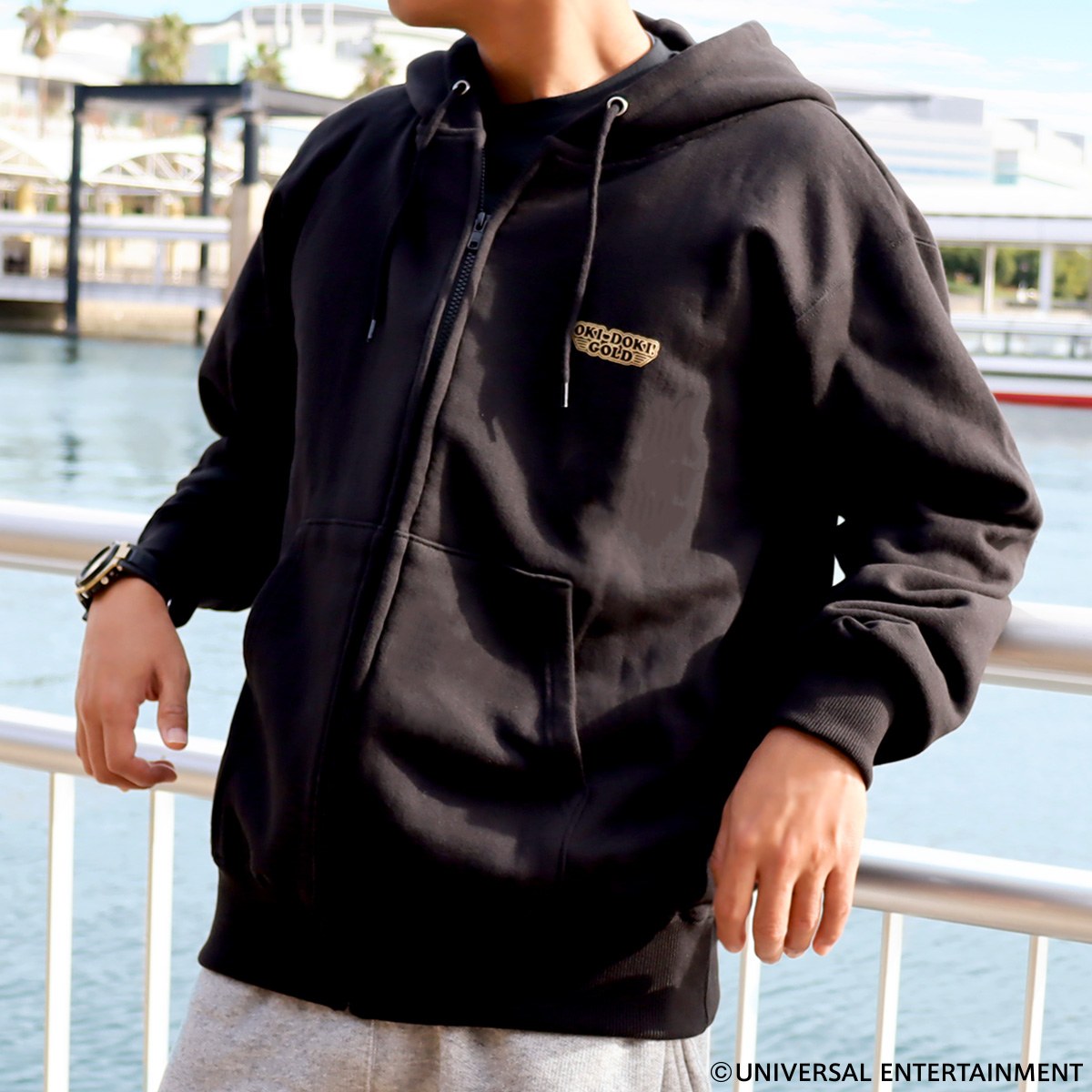 ブラック×ゴールドのカラーリングがクールなジップアップパーカー。
