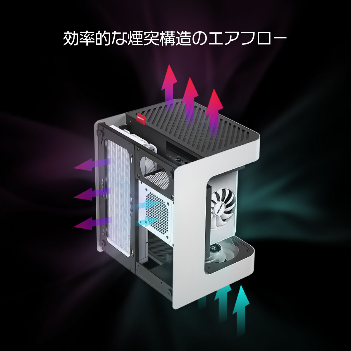 ケース底面に搭載された付属ファンから吸気し、熱気をケース上方や背面から排気するエアフロー構造で、効率的に内部の熱気を逃します。