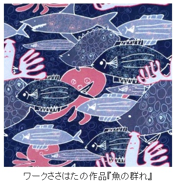 「ワークささはた」は、障害のある方の社会参加、自己実現、一人ひとりの特性に沿った自立のための支援を行っている障がい者支援事業所です(http://worksasahata.com/)。この「ワークささはた」の作品の特長は、子どもや動物といった具体的なものを描いたアートからなる作品群という点でした。チームメンバーがコミュニケーションを重ねながら一つひとつの作品を作り上げる制作過程や、多様性を尊重し他者との認め合いをテーマにした作品群に、当社は大変感銘を受けました。特に、魚たちが楽しく泳ぎ回る様子を描いた『魚の群れ』という作品は、“海の豊かさを守ろう”という、当社の新商品「海洋ゴミからつくったエコバッグ」が目指す世界と合致することを受け、「ユニファースト賞」に選出しました。