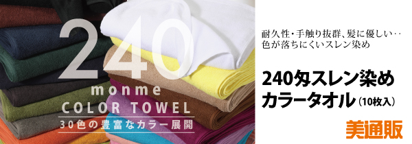 この様な背景から「美通販」では、低コストで肌触りに優れた「240匁スレン染めタオル(10枚入)」をピックアップし、業界最安値を目指した美通販会員特別価格でご提供します。この機会に、清潔なタオルでお客様に安心感を与えると共に、サロンの衛生管理のお役に立て頂きたい次第です。
