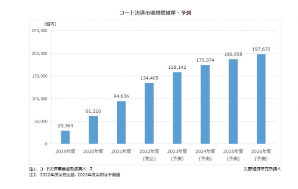 コード決済市場規模は、2026年度には19兆7,632億円まで拡大すると予測する。