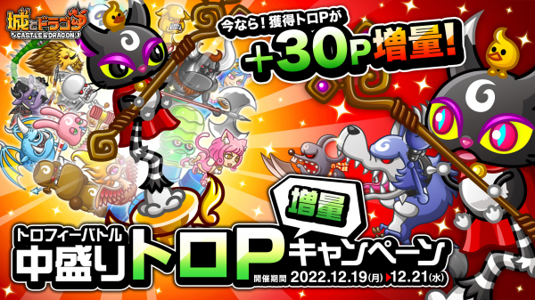 株式会社アソビズム(本社:東京都千代田区、代表取締役:大手智之)は、App Store・Google Playにて好評配信中の『城とドラゴン』で、「トロフィーバトル 中盛りトロP増量キャンペーン」を2022年12月19日(月)より開催いたします。