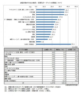 調査対象456社の販売・営業先ターゲットの業種を分類(※1社で複数業種をターゲットとするケースもあり、合計1,674件)し、それぞれの業種ごとの出現率を算出した。出現率を見ると、「マーケティング/サービス」(出現率35.7%)が163件でトップとなり、「小売/流通」(同35.3%)、「製造」(同34.9%)までが3割を越え、参入が多い分野であった。一方で、「農業・畜産」(同5.9%)、「教育・トレーニング」(同14.5%)、「自動車」(同16.7%)などが出現率の低い分野であった。
