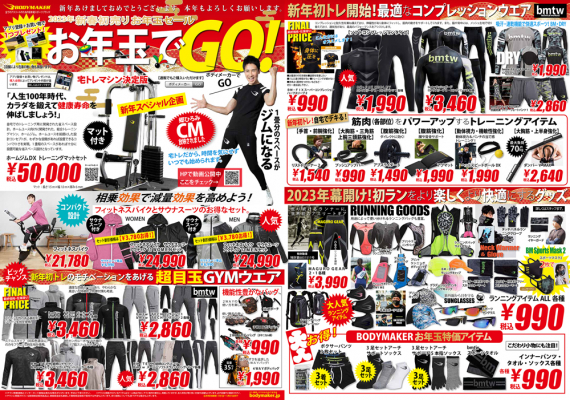 スポーツブランド「BODYMAKER」2023年のスタートを飾る直営店舗・直販サイトで「お年玉セール」を1月1日より同時開催いたします。今年はアプリ登録+ご購入者様へのお年玉プレゼント!や人気シューズを2足購入で1足プレゼント!(直営店舗のみ)など盛りだくさんの企画。また、1月1日に配布されるチラシ・WEB版にもおすすめ商品が満載。「宅トレ用品、冬物アウター・新作アパレル」などお正月価格でドドーンと放出!「2023年 元旦から全力SALE!」を開催します。(店舗セール期間:1月1日~31日まで。直販サイトセール期間:1月1日~10日まで。)詳しくは公式ウェブサイトをご覧ください。