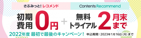 “おもてなしを科学する”株式会社イー・エージェンシー(本社:東京都千代田区、代表取締役:甲斐真樹)が提供している自社プロダクトブランド「さぶみっと!」の1つである、レコメンドサービス『さぶみっと!レコメンド/Contents Recommend』は、「初期費用無料(2月末までの無料トライアル付き)キャンペーン」を2022年12月15日(木)~2023年1月16日(月)まで開催します。