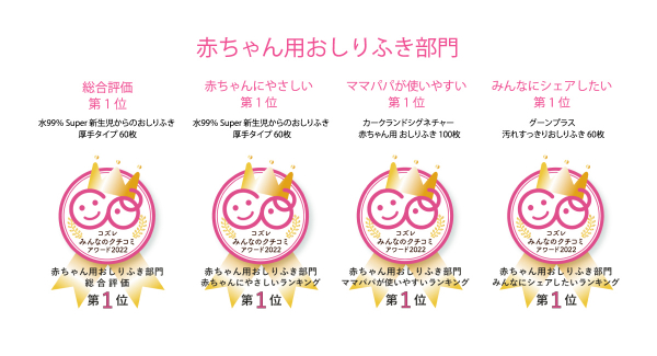 株式会社コズレ(本社:東京都千代田区、代表取締役:松本大希、以下コズレ)は、「赤ちゃん用おしりふき」を購入したことのある0歳~2歳までの子を持つコズレ会員を対象に「赤ちゃん用おしりふきに関するアンケート」を実施(調査期間:2022年9月2日~2022年10月3日、有効回答者数:1,061名、インターネット調査)し、その結果から『コズレみんなのクチコミアワード2022』赤ちゃん用おしりふき部門のランキングを、本日2022年12月26日に発表いたします。