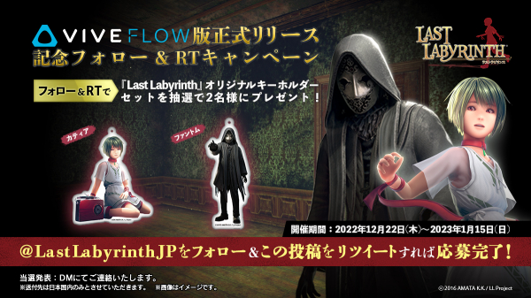 『Last Labyrinth』のVIVE Flow版の発売を記念して、公式Twitterにてプレゼントキャンペーンを実施いたします。公式Twitterアカウントをフォロー、該当投稿をリツイートで『Last Labyrinth』オリジナルキーホルダーセットを抽選でプレゼントいたします。この機会をお見逃しなく!