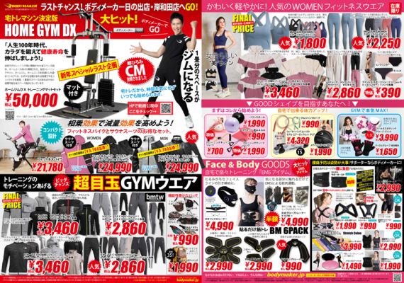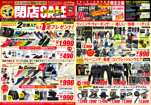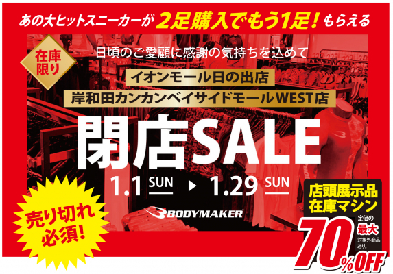 皆様に愛され続けてまいりましたボディメーカー イオンモール日の出店・岸和田カンカンベイサイドモールWEST店が、施設契約満了にともない閉店の運びとなりました。これまで永らくのご愛顧に感謝して、閉店セールが2023年1月1日(祝)からスタートします。お得な閉店ラスト価格の連続!セール終了日の1月29日(日)まで全力でお応えします。 注目は、店頭展示品在庫マシン最大70%OFF。永らくの間ありがとうございました。ぜひ、ご来店お待ちしております。