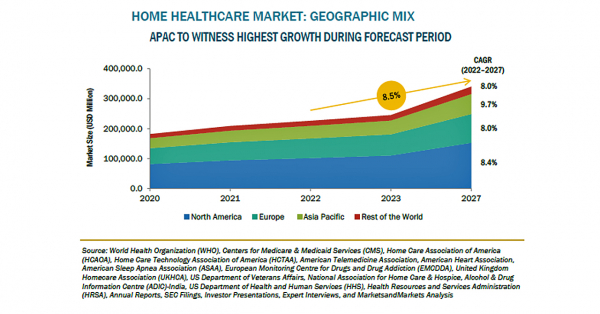 在宅医療市場は、北米、欧州、アジア太平洋、その他地域に分類されます。アジア太平洋地域は、2027年までの間、最も高いCAGRを記録することが予測されています。これは、在宅医療を推進する政府による取り組みや、医療費の高騰などの要因が挙げられます。