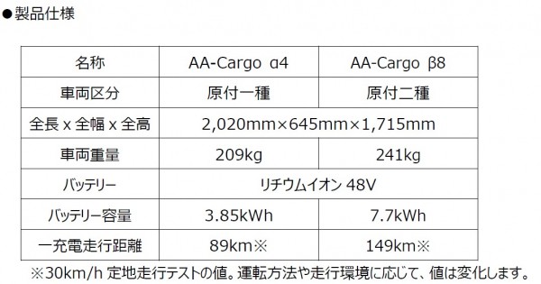 aidea社が販売する商用3輪電動バイク「AA-Cargo α4/β8」は、既存バイクメーカー以外では初となる型式認定を取得し、国※1および東京都※2からエコカーや電動バイク普及促進の補助金対象車両として指定されるとともに、国内の宅配便業界や大手外食チェーンなどに導入されています。また、2023年に発売予定の2輪の電動バイク「AA-wizシリーズ」は、他社比約1.5倍容量のバッテリーを搭載することで、全?や重量は同等でありながら、一充電走行距離が他社製品に比べて長い走行性能を目指しています。